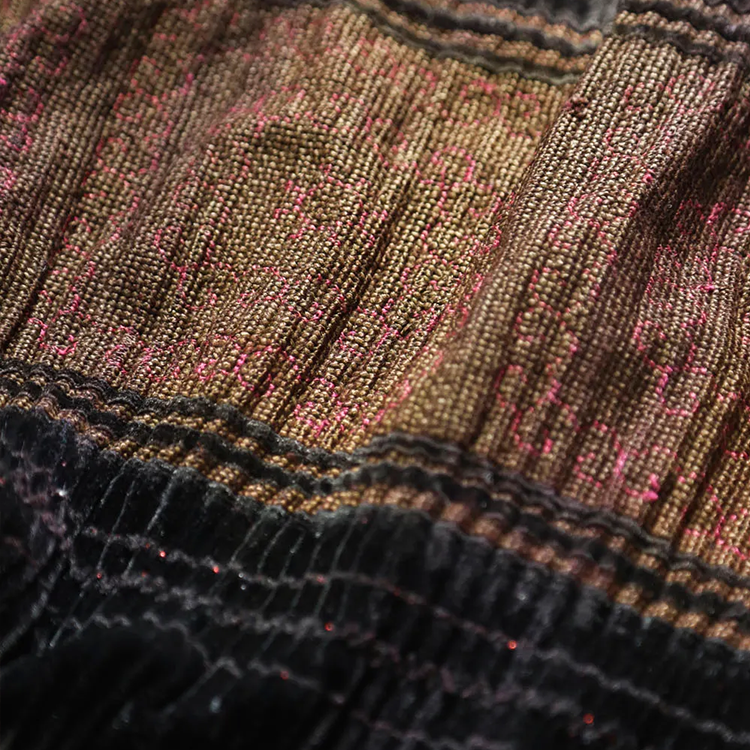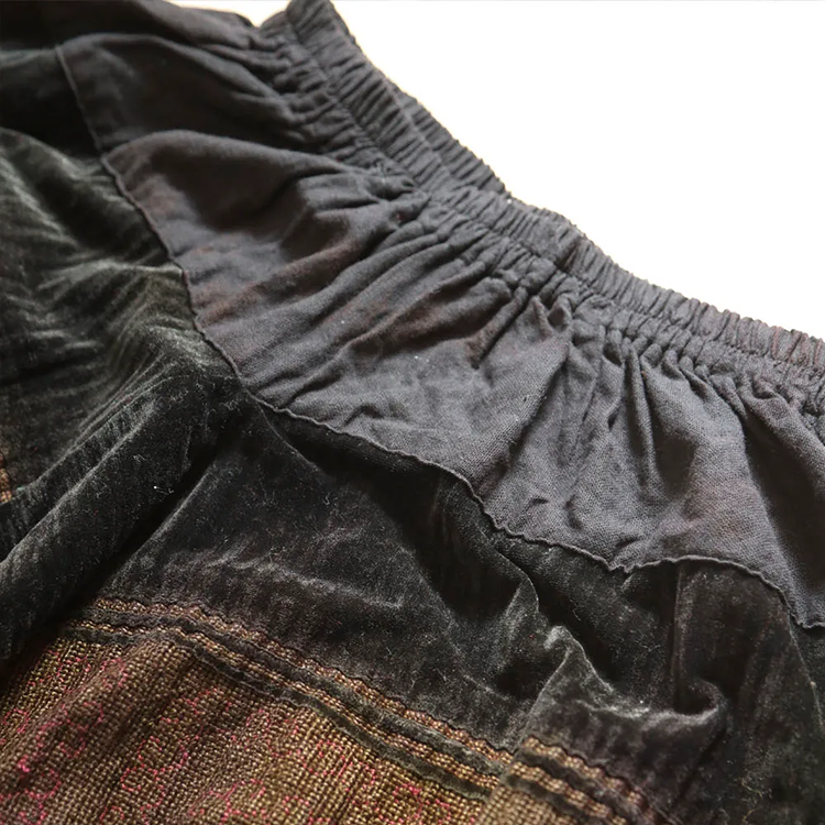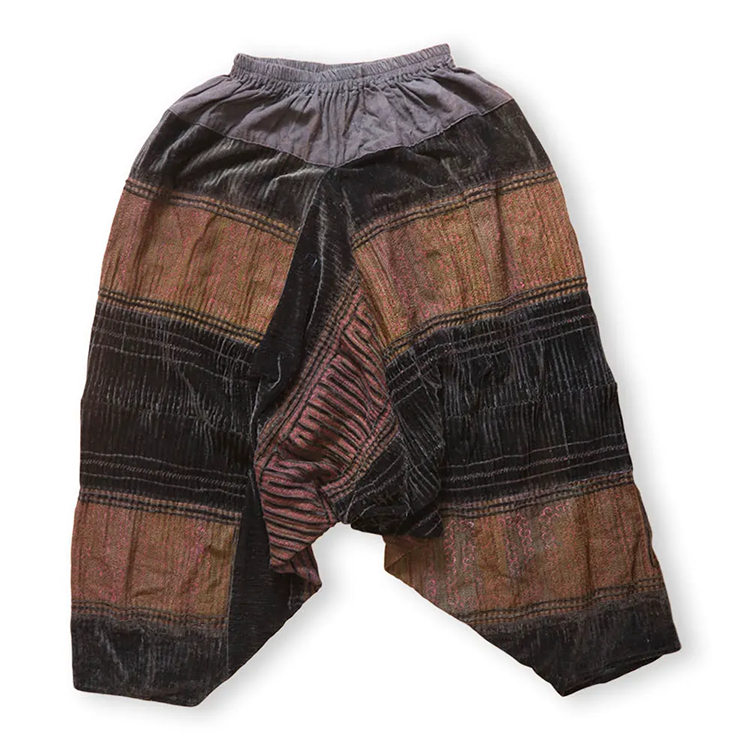 这些羚羊型裤子采用复古面料制成,用于居住在泰国北部山区的苗族传统服饰。泰北山区温差较大,早晚较冷,服装多采用耐寒的丝绒类布料。最近有一种印刷图案的技术,不过这次是用传统手工刺绣面料制成的复古单品。这是一款富有表现力的单品,饰有原本是裙子的褶皱。每件商品都有不同的表情,所以请找到您最喜欢的。