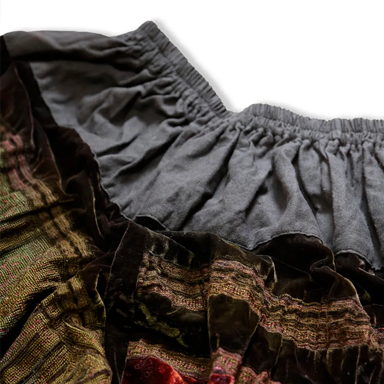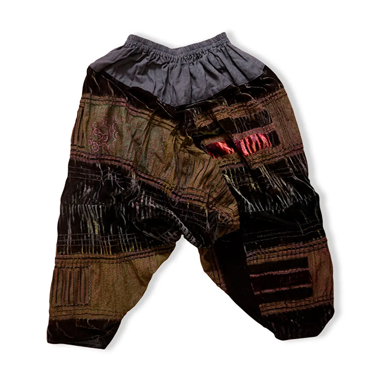 这些羚羊型裤子采用复古面料制成,用于居住在泰国北部山区的苗族传统服饰。泰北山区温差较大,早晚较冷,服装多采用耐寒的丝绒类布料。最近有一种印刷图案的技术,不过这次是用传统手工刺绣面料制成的复古单品。这是一款富有表现力的单品,饰有原本是裙子的褶皱。每件商品都有不同的表情,所以请找到您最喜欢的。