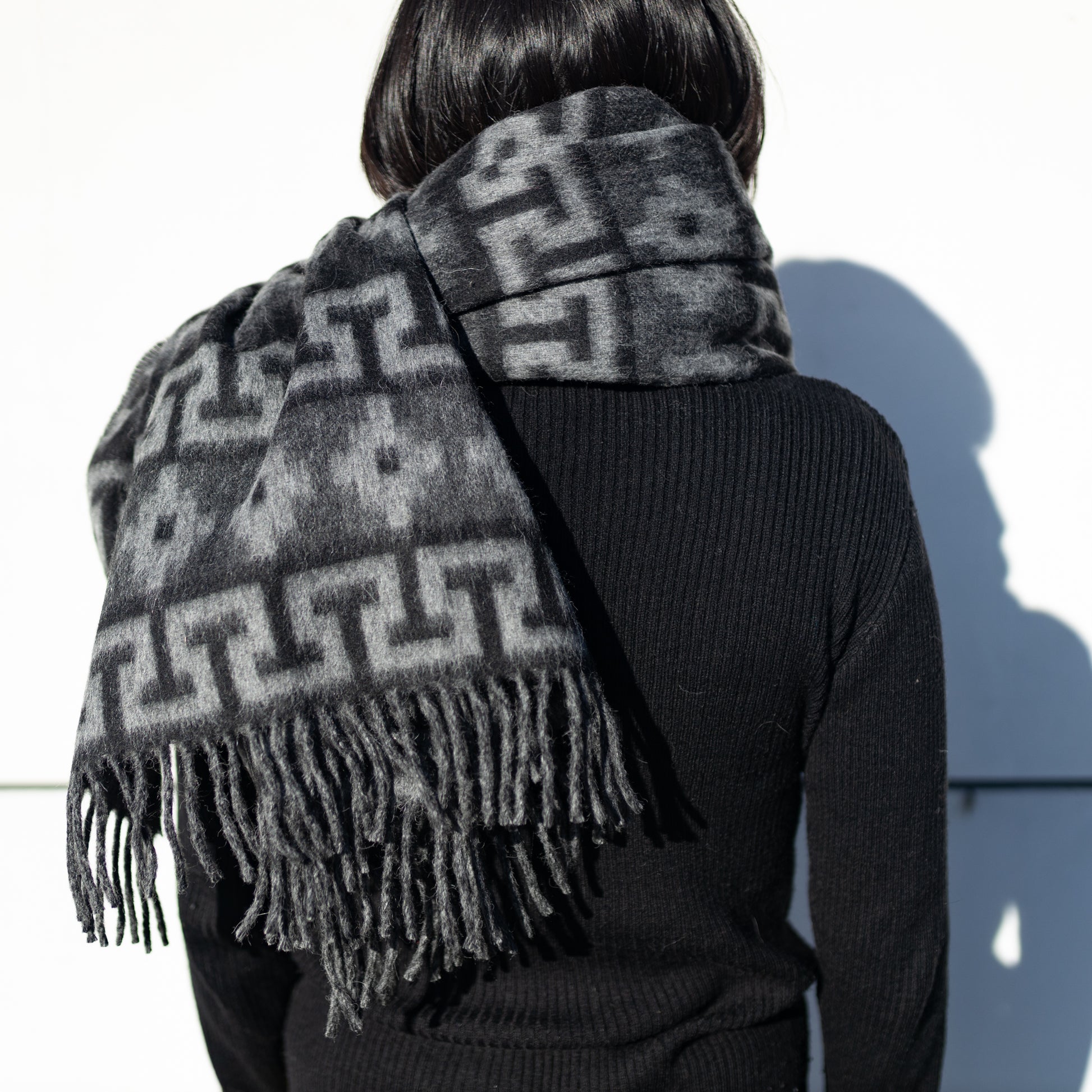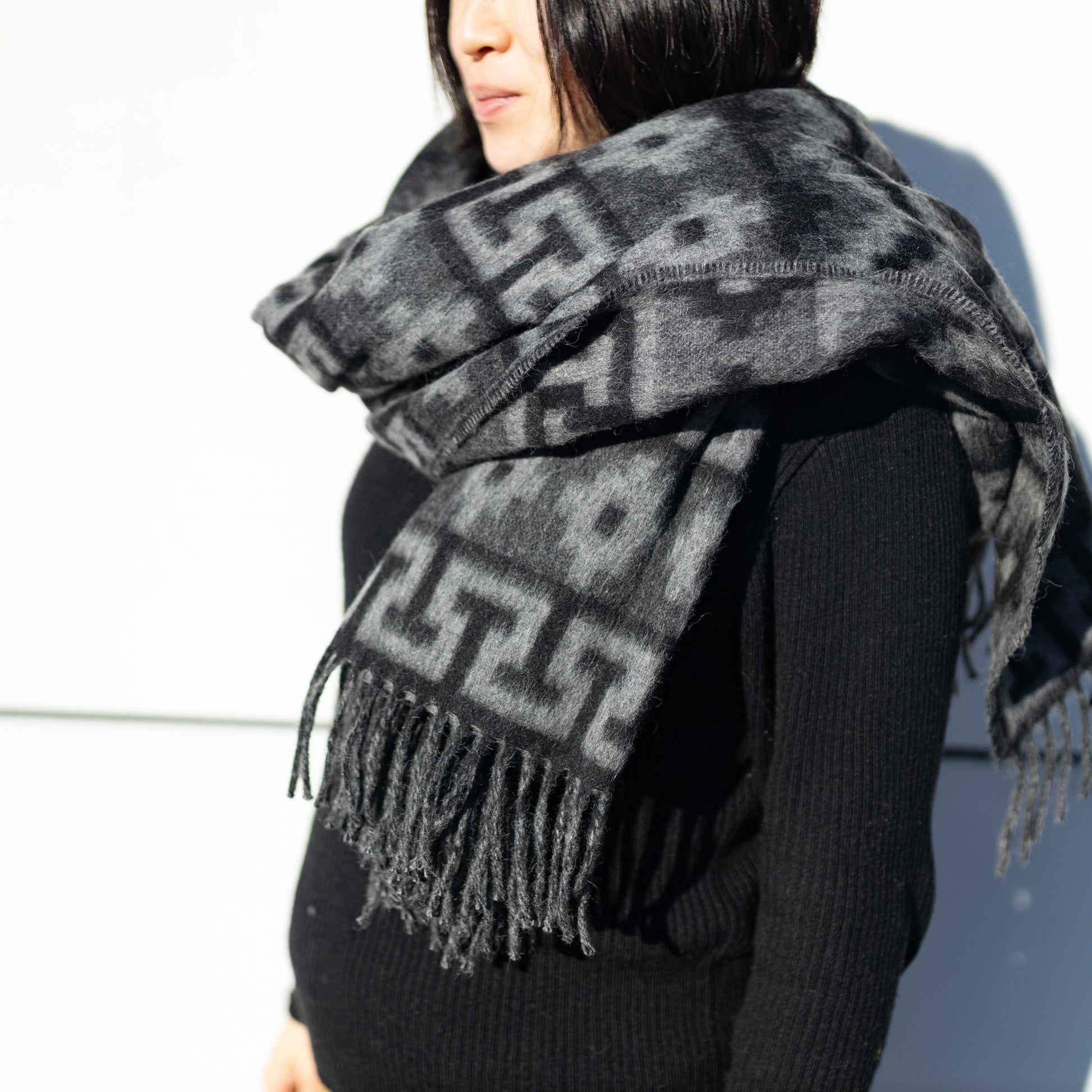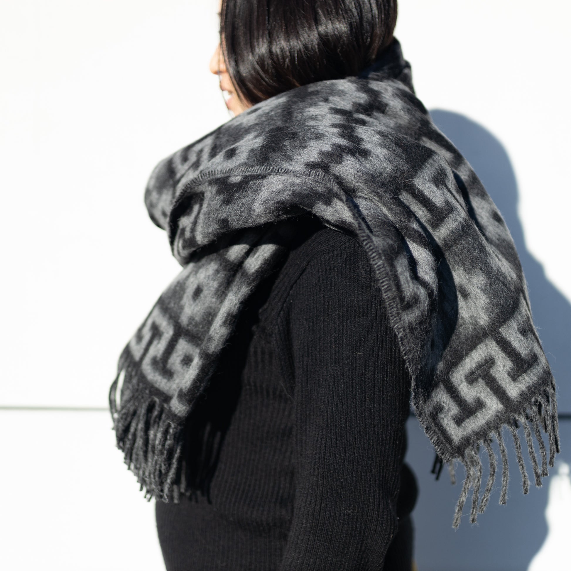 アルパカウール大判ストール (インカ柄)|ブラック×グレー