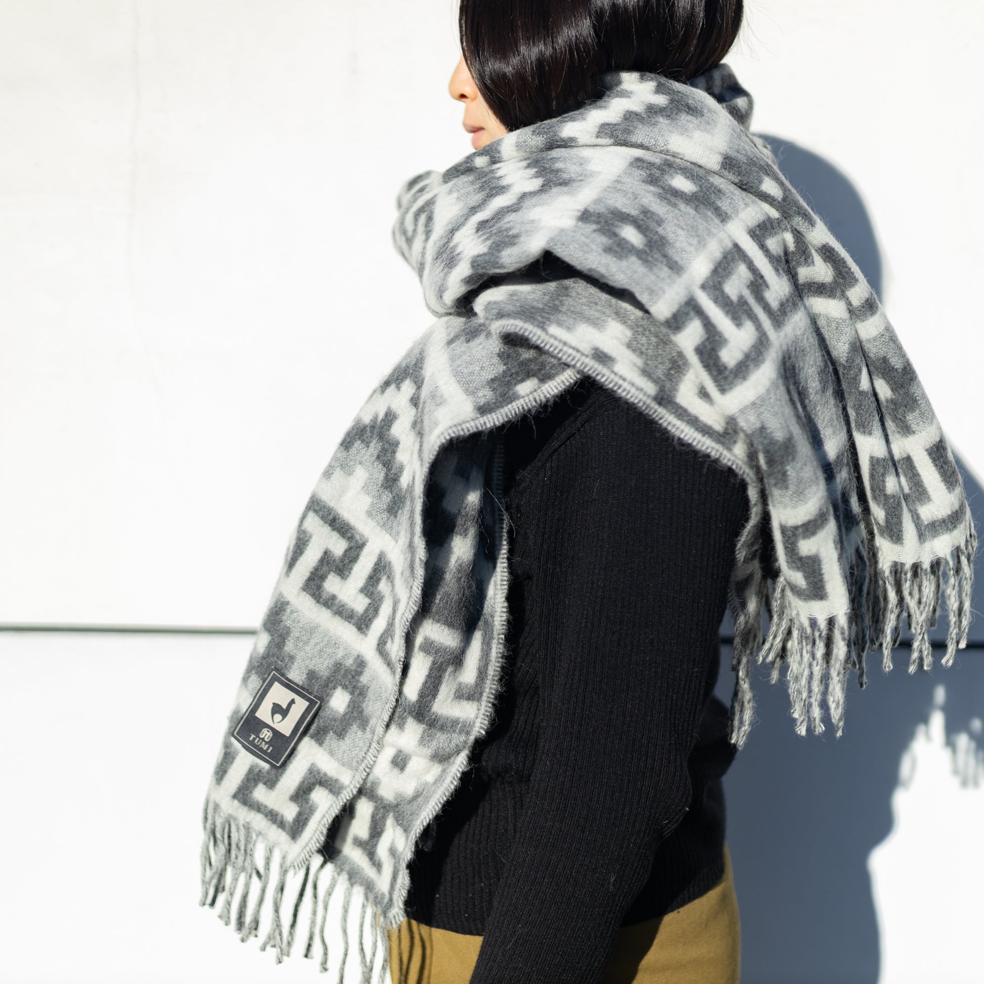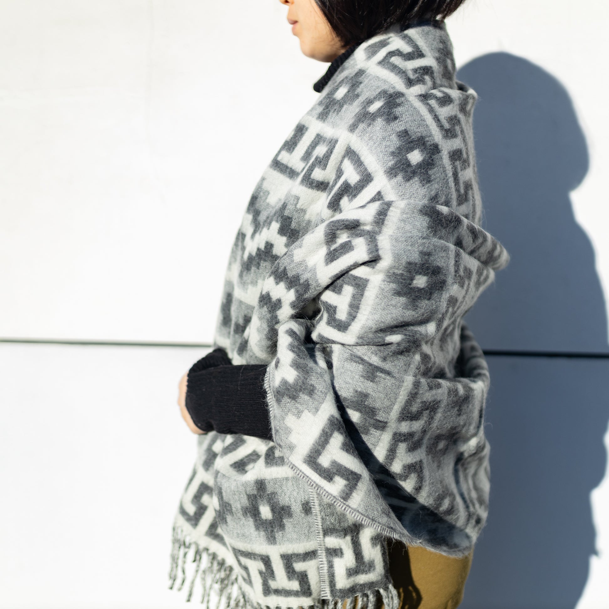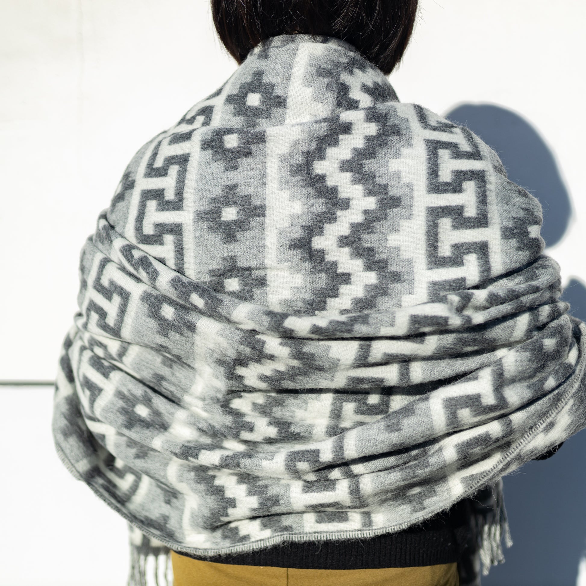 アルパカウール大判ストール (インカ柄)|ホワイト×グレー