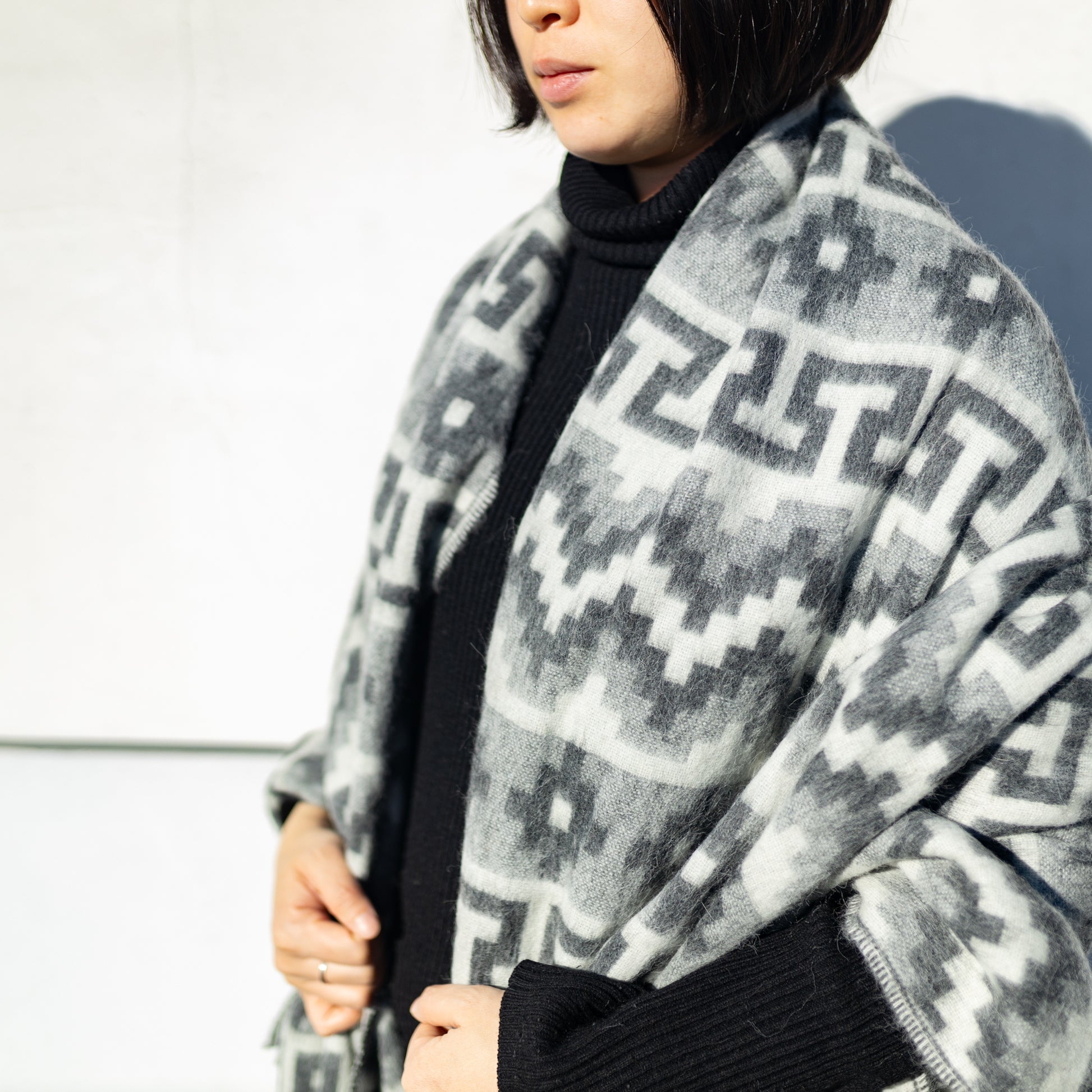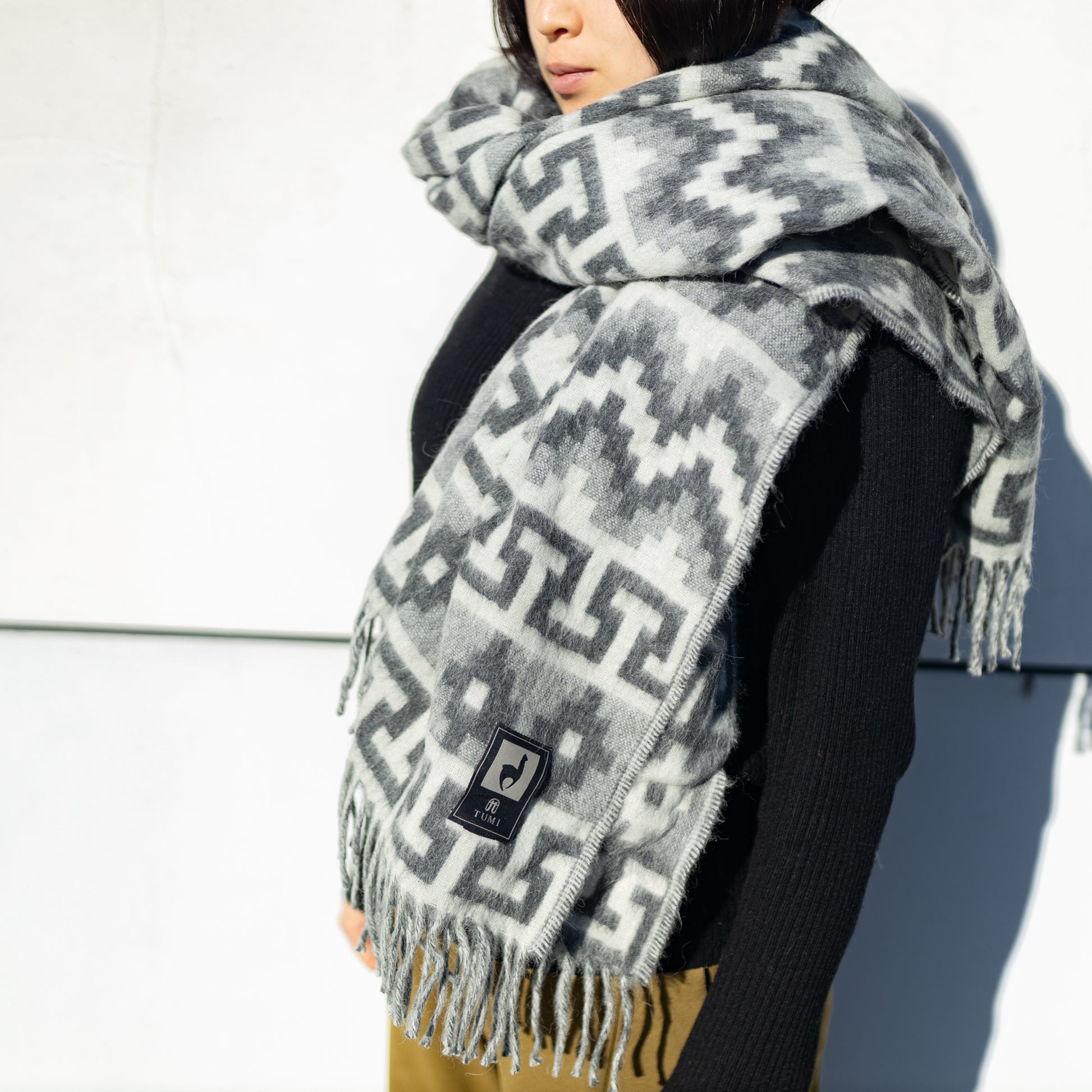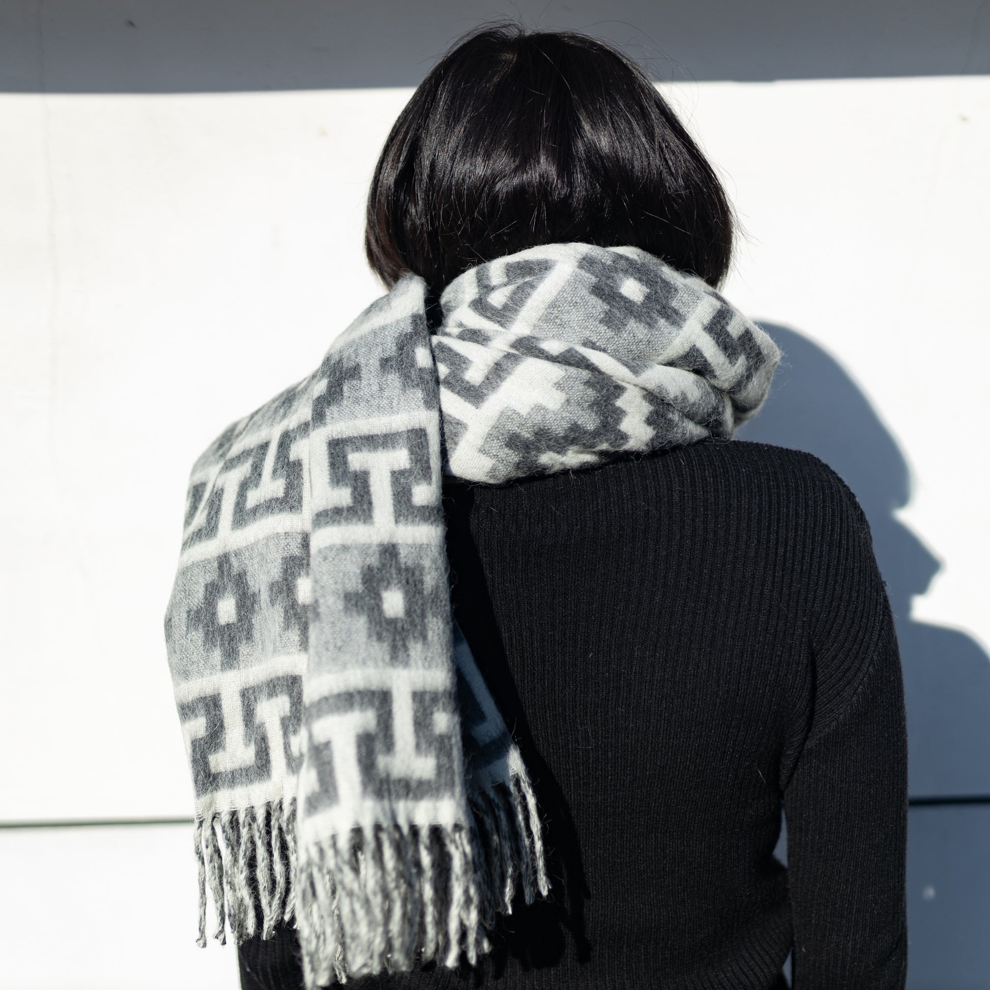 アルパカウール大判ストール (インカ柄)|ホワイト×グレー