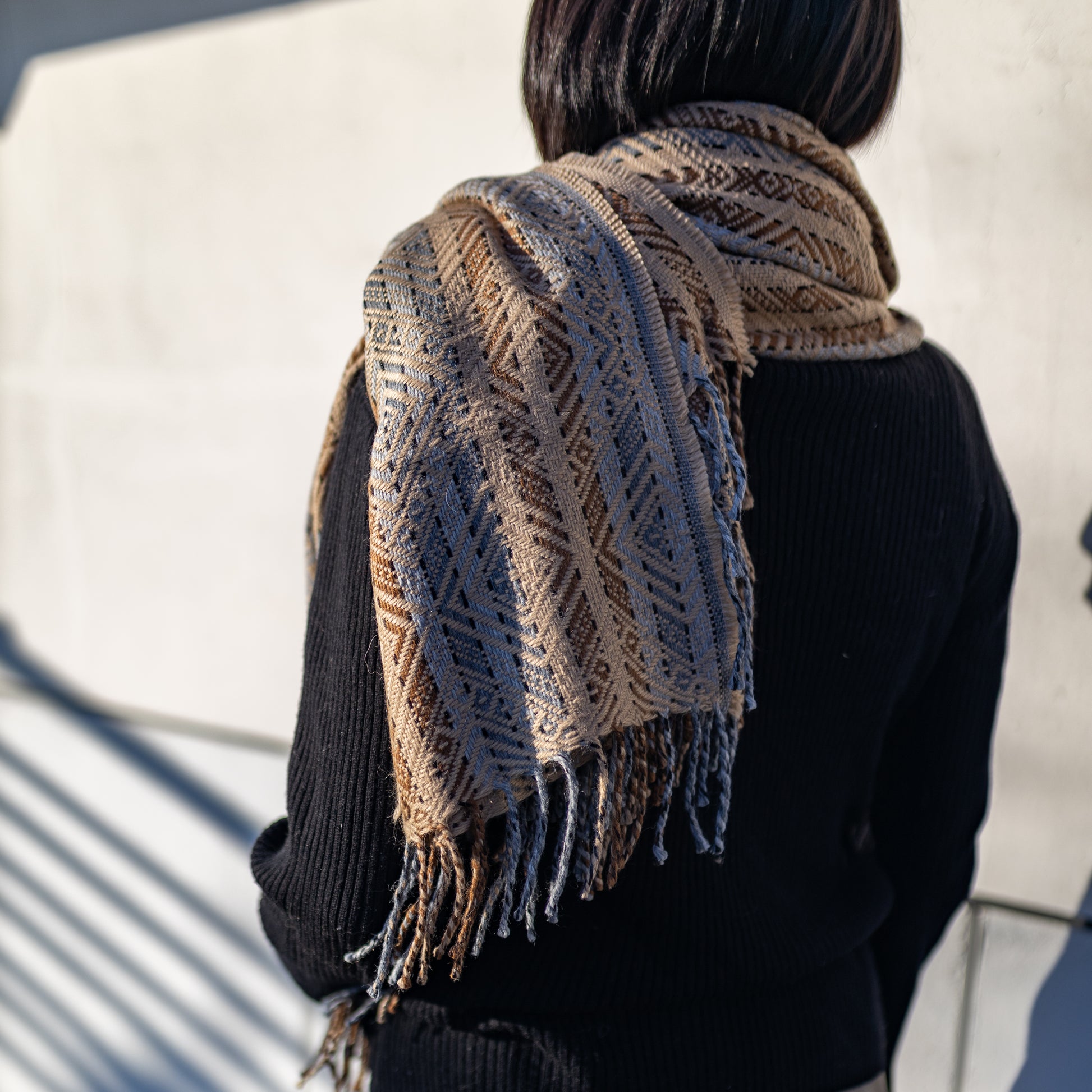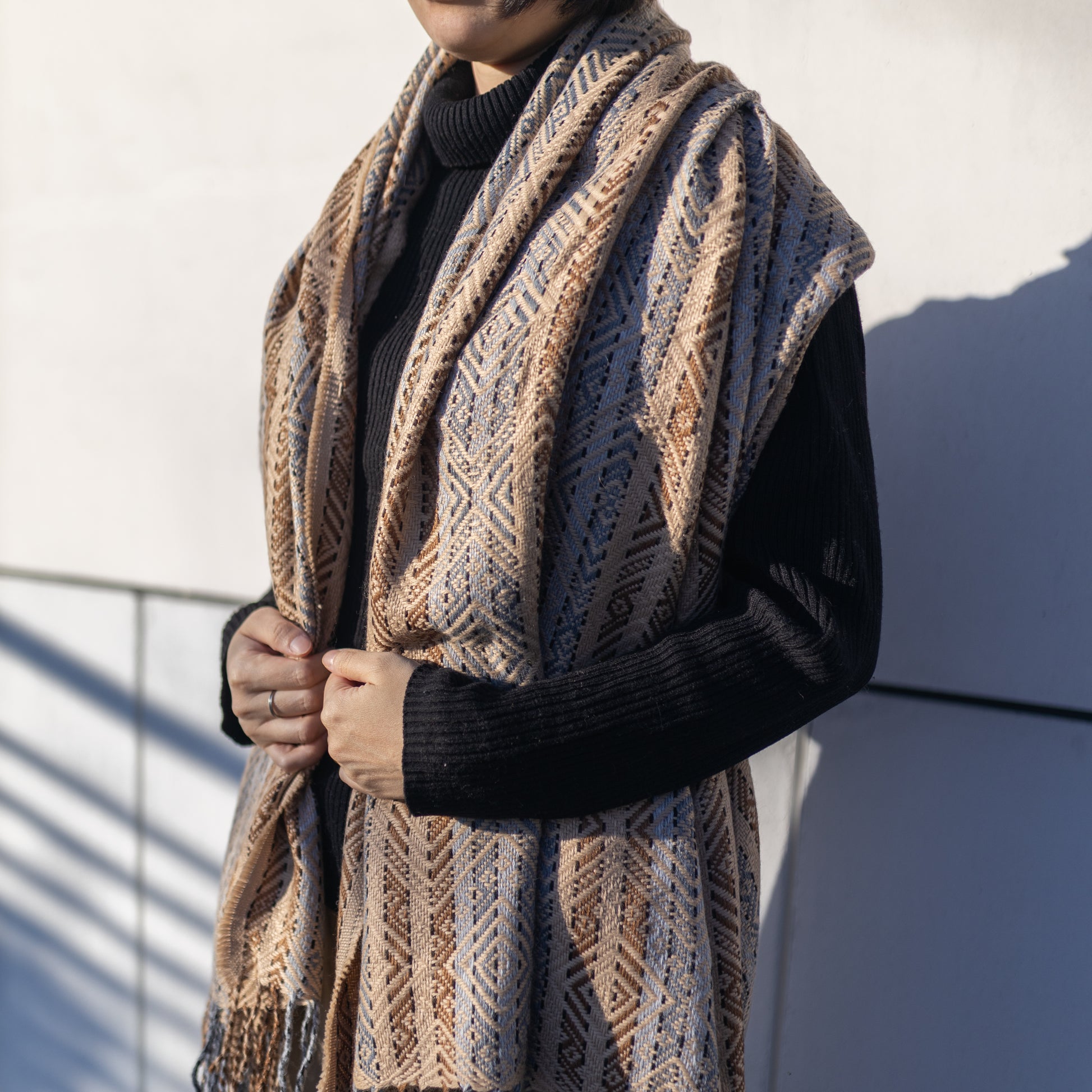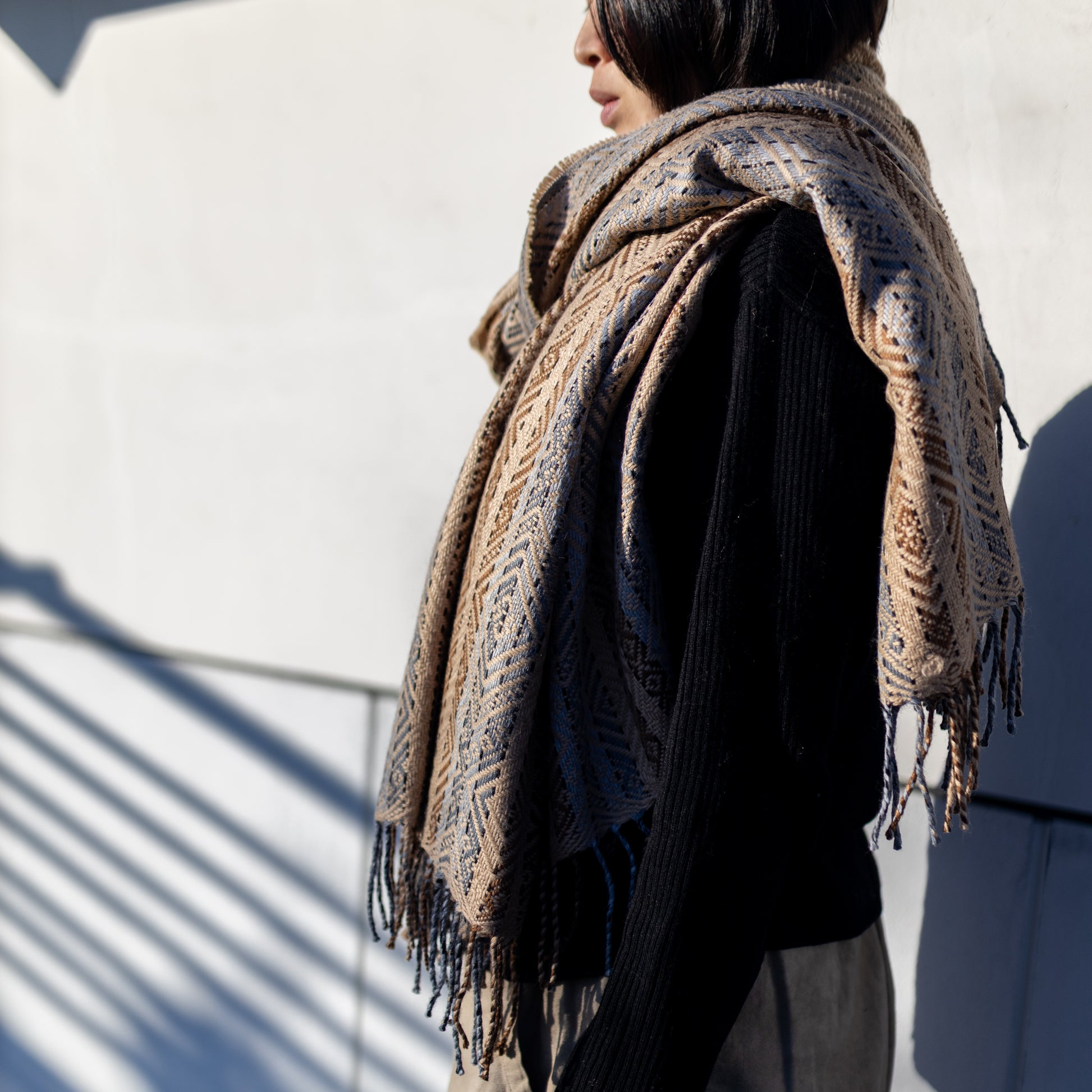 ペルー産アルパカ毛とアクリルのミックスで作られた大判ストール。軽くて柔らかな肌触りと丈夫さを兼ね備え、毛玉になりにくいのが特長です。アルパカ繊維の温度調節機能により、優れた保温性と通気性を実現。暖かいのに蒸れず、快適にお使いいただけます。高品質で長く愛用できる一枚は、大切な方へのギフトにも最適です。