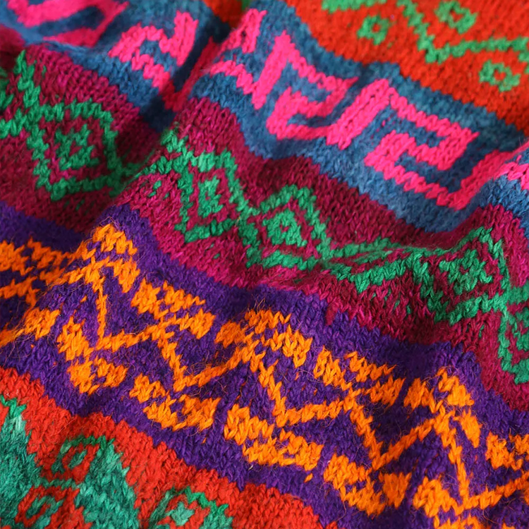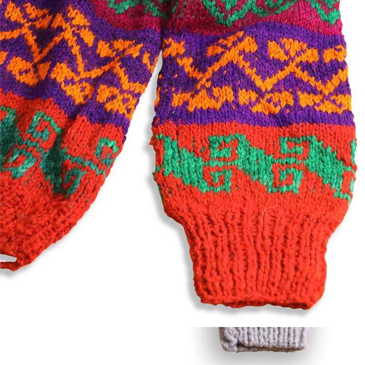 这件毛衣是由一位在玻利维亚拉巴斯经营民间艺术商店的姐姐手工编织的。该商品的图案以南美颜色代表古柯叶和的的喀喀湖的波浪。它由粗毛纱编织而成,给人一种粗犷随意的感觉,同时又不失柔软舒适。由于是手工编织,领口宽度可能存在个体差异。这是您在任何地方都找不到的独特作品。